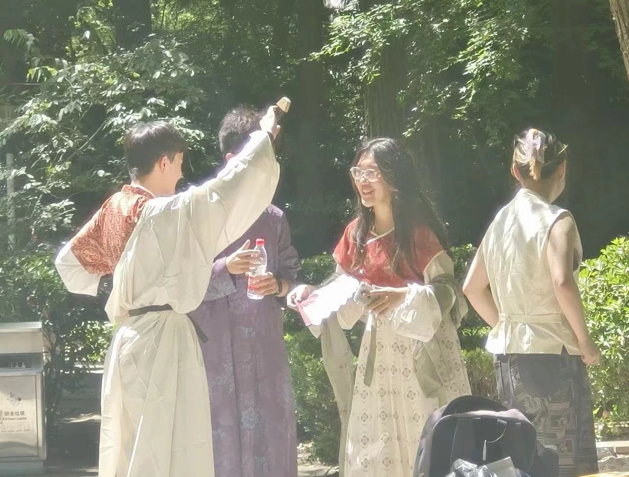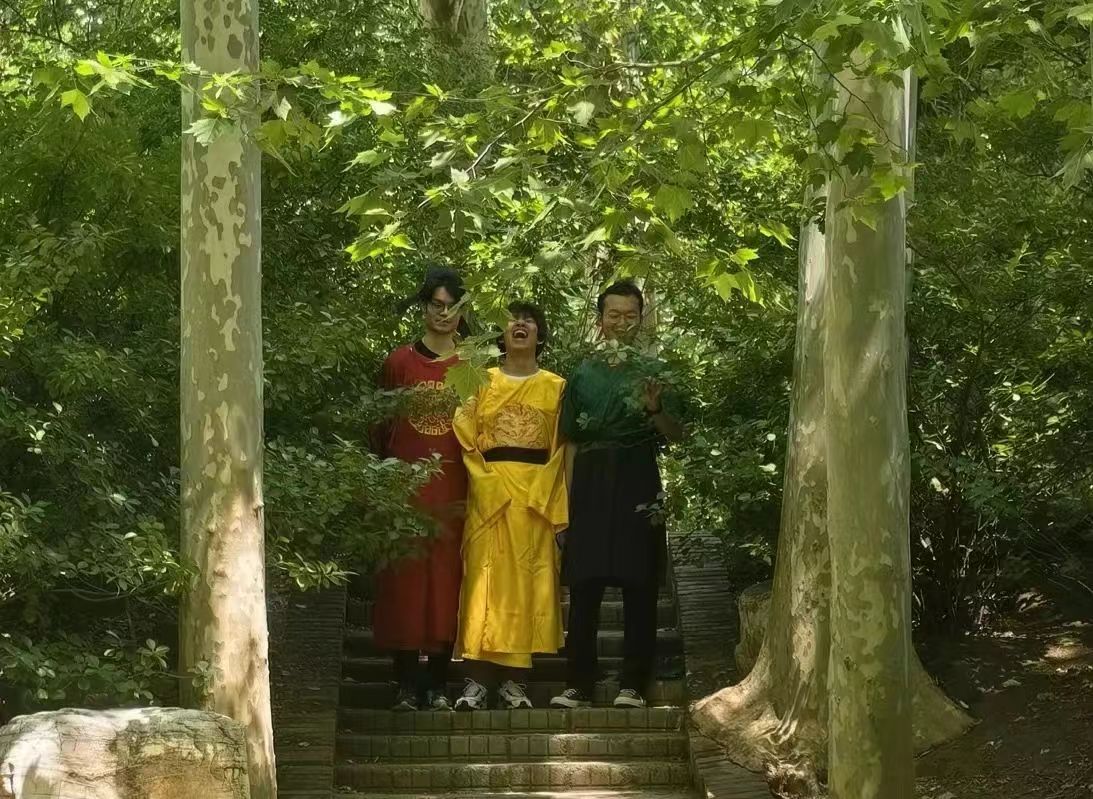 作為環(huán)境戲劇演出,我們創(chuàng)造性地打破傳統(tǒng)舞臺演出中的“第四面墻”,走出劇場,將劇目融入環(huán)境、融入校園,加入互動環(huán)節(jié),邀請觀眾沉浸式體驗戲劇魅力;學(xué)生與教職工聯(lián)合出演,打造師生交流舞臺,共同繪就李白詩意人生。