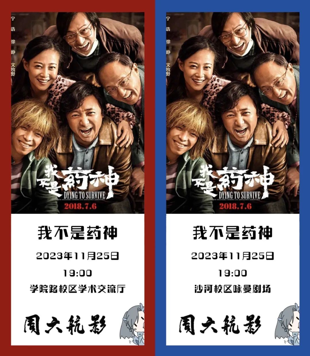 11月25日(周六)19:00,《我不是藥神》將于學院路校區學術交流廳和沙河校區詠曼劇場同步放映。