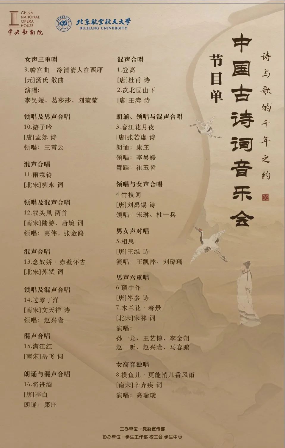 10月12日(周四)下午7:00于學院路校區晨興音樂廳,中央歌劇院將為大家傾情表演《中國古詩詞音樂會》。