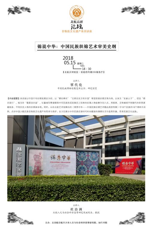 本講座以中國千年織錦發展史為經,以“素紗禪衣”“五星出東方利中國”等國寶級織錦文物為緯,以宋玉“東家之子”、項羽“錦衣夜行”、楊玉環“霓裳羽衣曲”、吐蕃祿東贊請婚等中華民族形成發展史上經典的織錦人物故事為切入點,用圖表、文物闡明不同朝代的審美邏輯線條、不同歷史人物的織錦美學觀。同時,以在北航藝術館展出的《錦秀中華——中國民族織錦藝術精品高校特展》中16個民族的18個錦種為實例,點評中國少數民族非物質文化遺產的傳承與保護,全方位展示中華民族在新時代時尚靚麗的錦繡生活與俊美形象,傳承民族文化血脈。