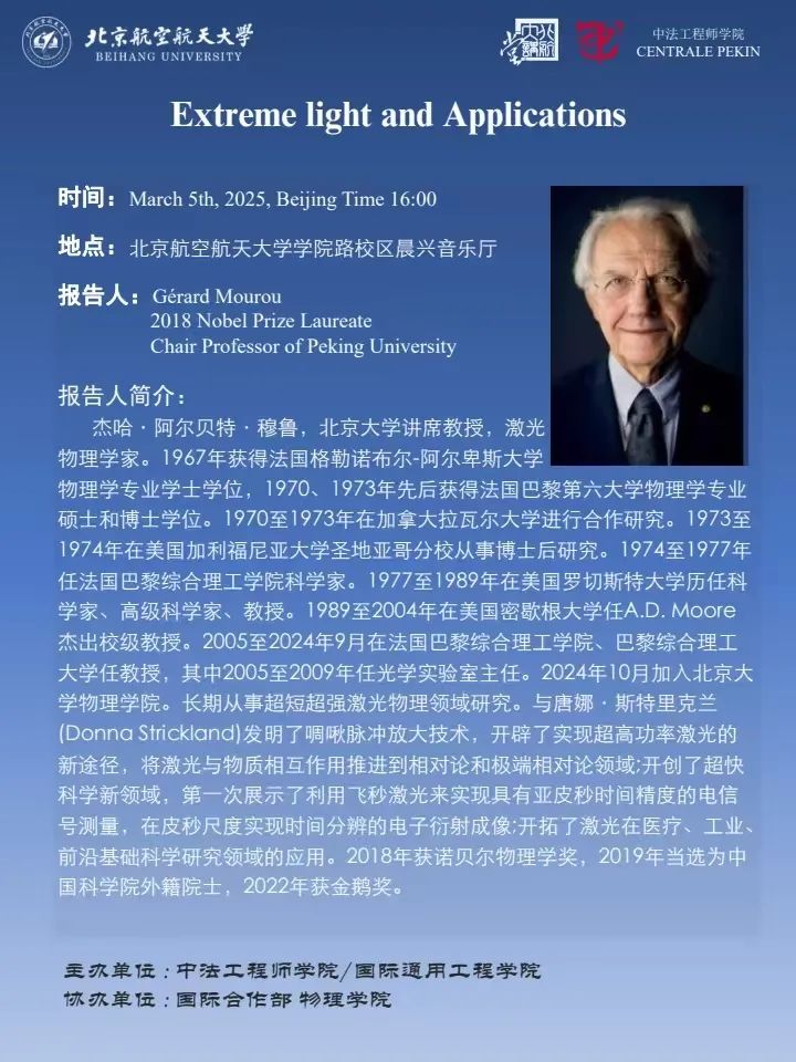 為紀念學院建院20周年,在國際合作部和物理學院的支持下,中法工程師學院/國際通用工程學院邀請到2018年物理學諾貝爾獎獲得者Gérard Mourou,做客北航探討極端光學及其應用,