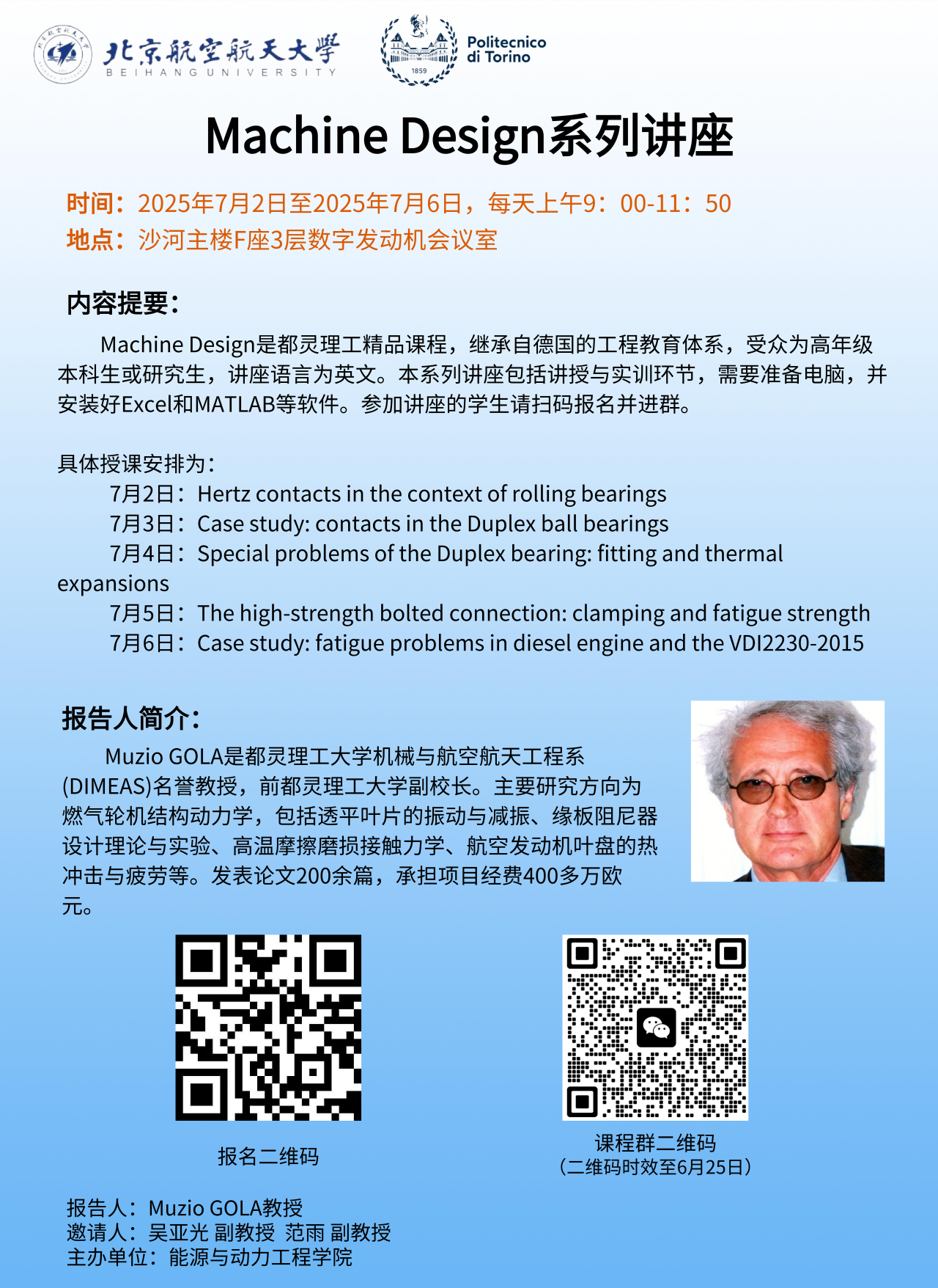 Machine Design是都靈理工精品課程,繼承自德國的工程教育體系,受眾為高年級本科生或研究生,講座語言為英文。本系列講座包括講授與實訓環節,需要準備電腦,并安裝好Excel和MATLAB等軟件。參加講座的學生請掃碼報名并進群(詳見附件海報)。