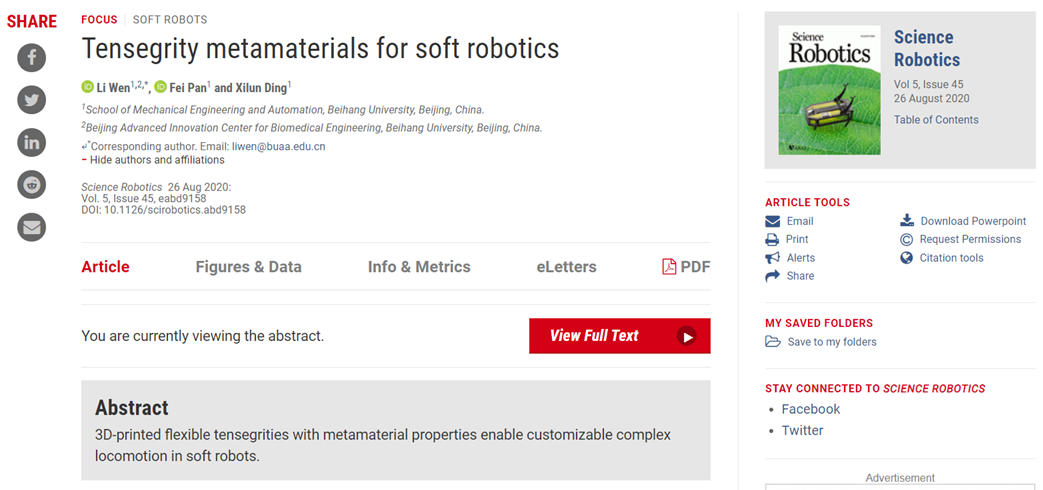 8月26日,《科學》雜志子刊《科學·機器人學》(Science Robotics)刊登了我校機械學院研究團隊題為“Tensegrity metamaterials for soft robotics”的特邀評述論文(Focus article)。論文對張拉整體結構超材料軟體機器人的最新研究進展進行了評述。機械學院文力教授為本文第一兼通訊作者,丁希侖教授與卓越百人博士后潘飛為本文的共同作者。