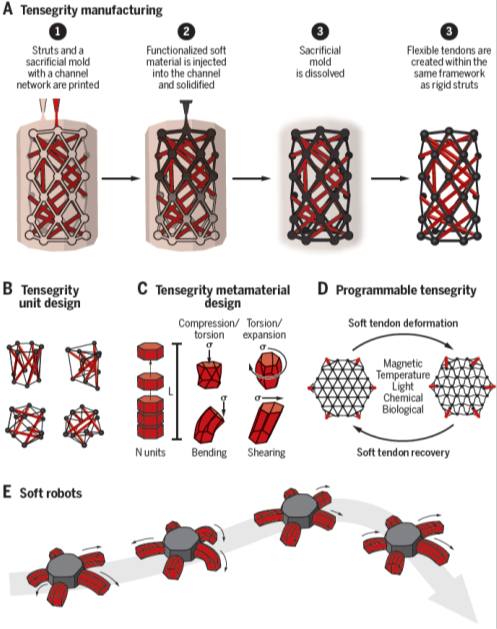 針對此問題,研究團隊回顧并分析了傳統的張拉整體結構,并著重介紹了Science Robotics近期報道的一種新的張拉整體結構加工方法。該方法可以快速完成磁性軟材料和剛性桿件的一體化制造,并可用于加工具有壓扭/拉扭、力學性能可編程等特性的張拉整體結構力學超材料,應用于軟體機器人設計 ( https://doi.org/10.1126/scirobotics.aay9024)?;谶@種超材料的軟體機器人在磁場或電機驅動下可實現翻滾、定向爬行等多種運動模式。研究團隊認為該一體化制造方法成功地將功能化軟材料網絡和孤立的剛性桿快速有效地集成在一起,為制造多尺度、多材料的可編程張拉整體結構提供了可行方法。
