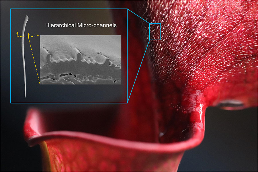 瓶子草這一成果源于一次偶然的發現。研究團隊曾在國外某攝影網站上看到一組植物的微觀照片。俗話說:“外行看熱鬧,內行看門道”,瓶子草規則的表面結構引起了他們極大的興趣。在微觀納米維度,一些看上去雜亂無章的表面若通過微納結構可控制造使其具有規則的紋理,之前觀察不到的一些現象也會隨之體現出來,因此表面的微結構控制非常重要,我們熟知的“鯊魚皮效應”便是在表面的規則結構上做文章。表面功能化技術有著相當廣泛的運用,而要想得到具有某項功能的理想微結構表面,在沒有一個現成的設計理論的情況下,師法自然無疑是一個捷徑。