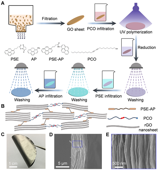 圖1. 有序交聯(lián)石墨烯薄膜的制備過(guò)程(A-B)及照片(C)和橫截?cái)嗝嫖⒂^形貌(D-E)