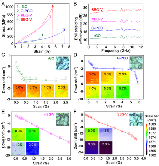 圖2. 有序交聯(lián)石墨烯薄膜的力學(xué)(A)和電磁屏蔽效能(B),以及原位拉曼光譜表征(C-F)