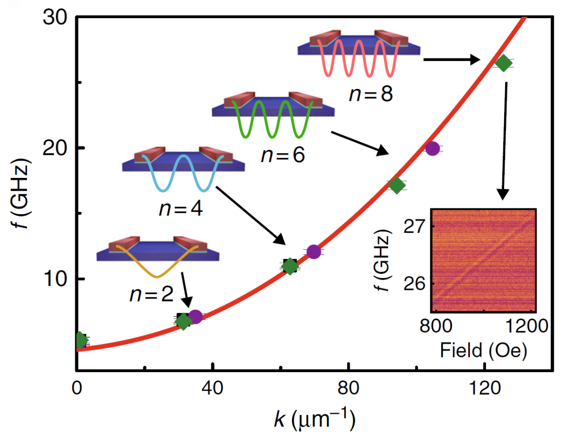 激發(fā)超短波長的自旋波能夠減小器件尺寸,提高集成度,同時(shí)短波長對應(yīng)著更高的頻率,自旋邏輯器件也會有更快的運(yùn)算速度。但想要激發(fā)出短波長自旋波可不容易,實(shí)驗(yàn)過程中所需測量的自旋波頻率最高超過了30GHz,這已經(jīng)接近目前測量系統(tǒng)的極限,為了獲得令人信服的結(jié)果,于教授的團(tuán)隊(duì)通過長時(shí)間的校準(zhǔn)和調(diào)試才得到了清晰的自旋波信號,為之后的進(jìn)一步理論分析打下了可靠的基礎(chǔ)。