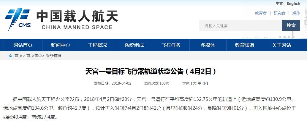 據新華社2018年4月2日消息,經北京航天飛行控制中心和有關機構監測分析,2018年4月2日8時15分左右,天宮一號目標飛行器已再入大氣層,再入落區位于南太平洋中部區域,絕大部分器件在再入大氣層過程中燒蝕銷毀。